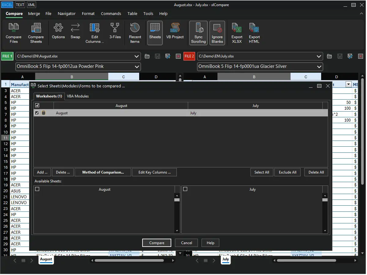 Select sheets and VBA modules to be compared. If your Excel file has a number of worksheets, in this window you can pair them correctly and review key columns and table heading areas for all the sheets in your Excel files.