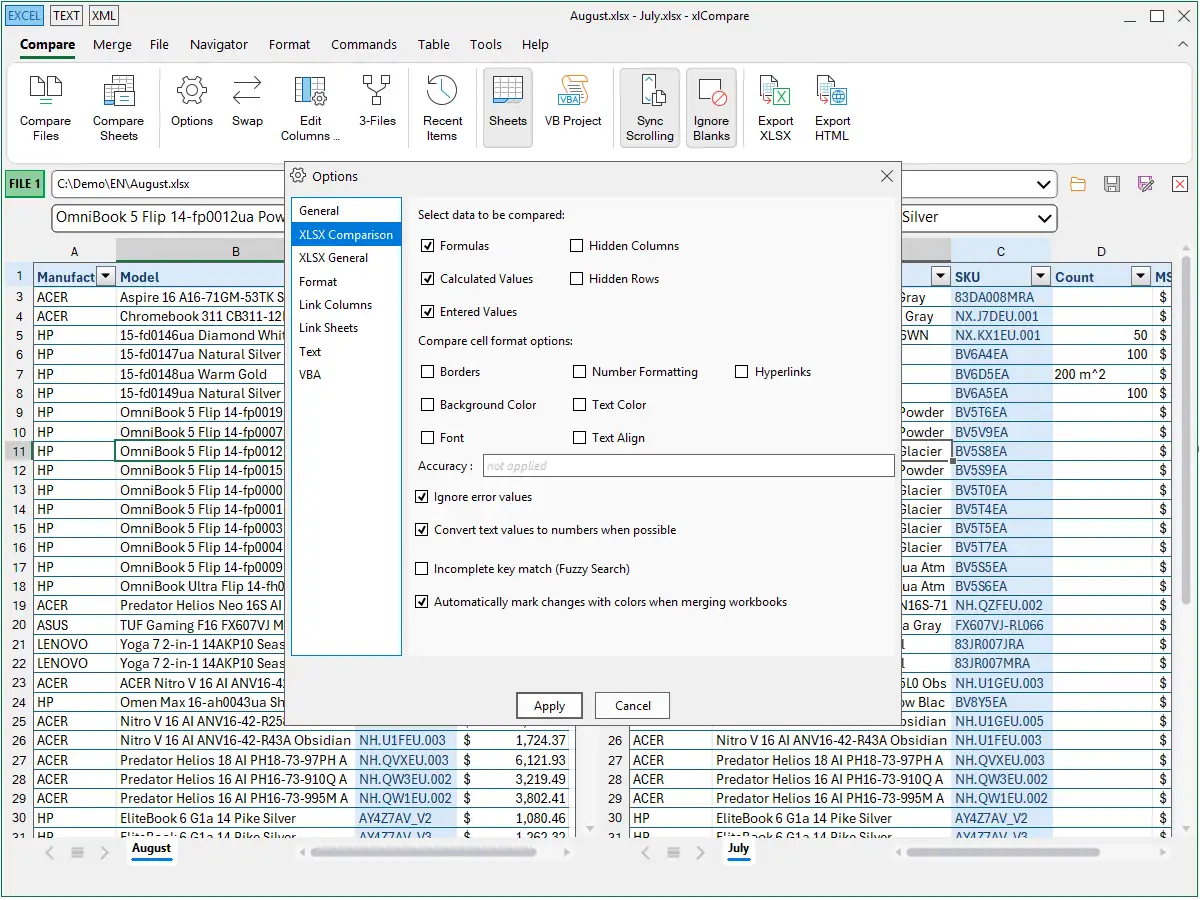 Compare 2 Excel files and export color coded comparison report into XLSX, PDF or HTML file.
